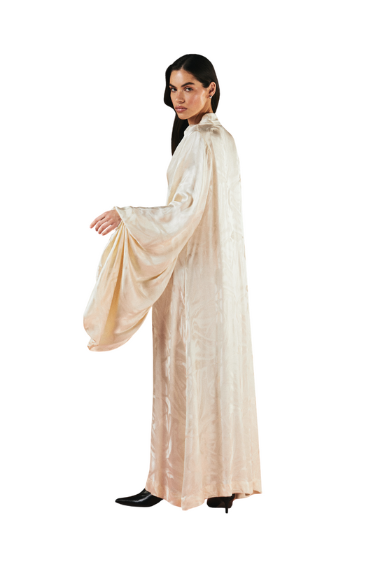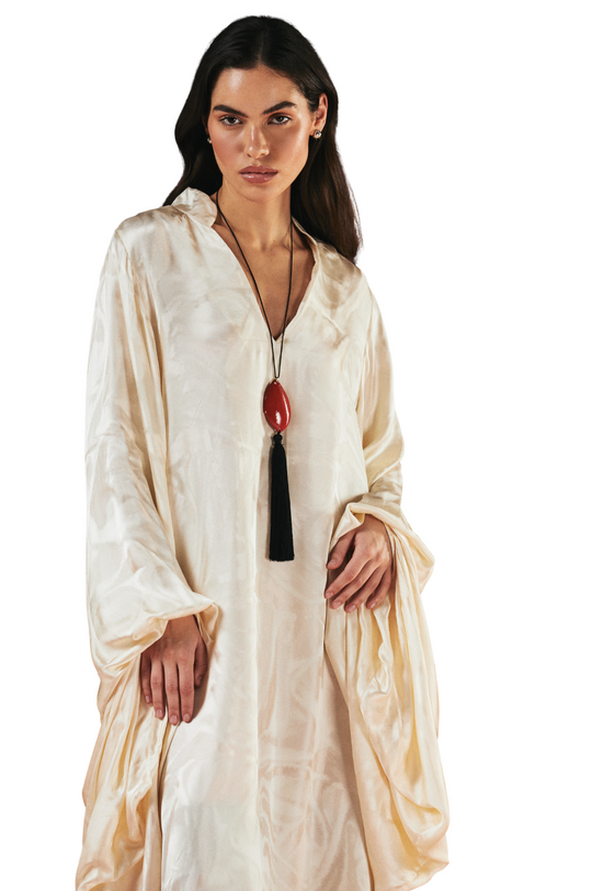 This elegant white silk dress offers a light, airy feel with intricate detailing. The mandarin collar adds a refined touch to the v-neckline, creating a flattering silhouette. Voluminous balloon sleeves, cinched at the wrists, provide a beautiful contrast to the sleek fit of the dress. Styled with our red 1309 fish tassel necklace and the 1309 silver fish bag, the look is elevated with bold, artistic accessories that add striking pops of color and playful charm.
