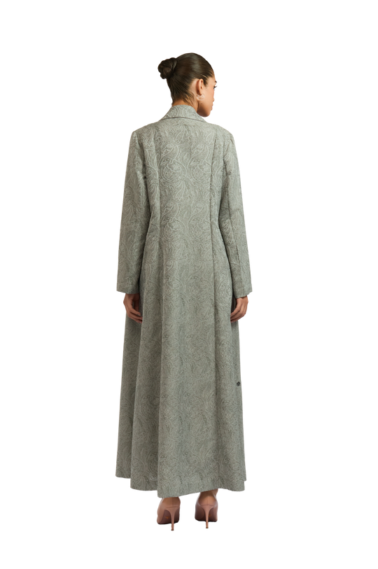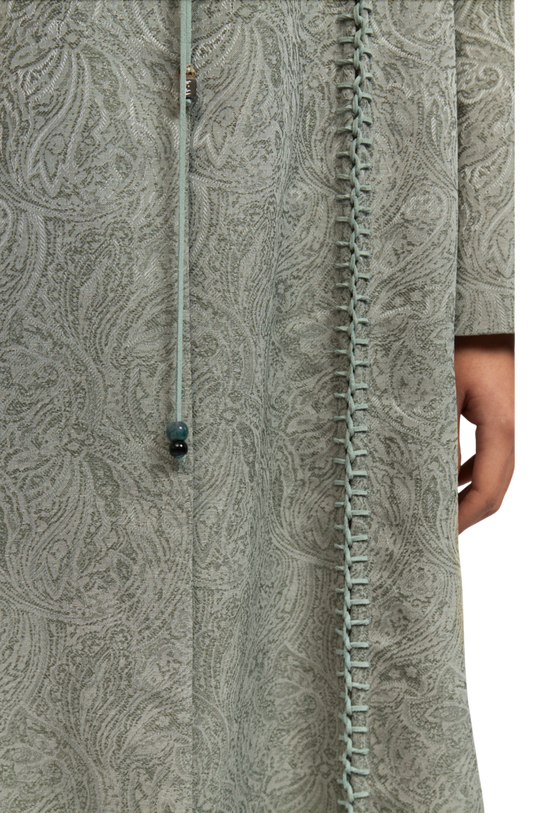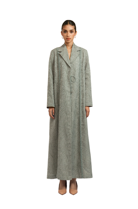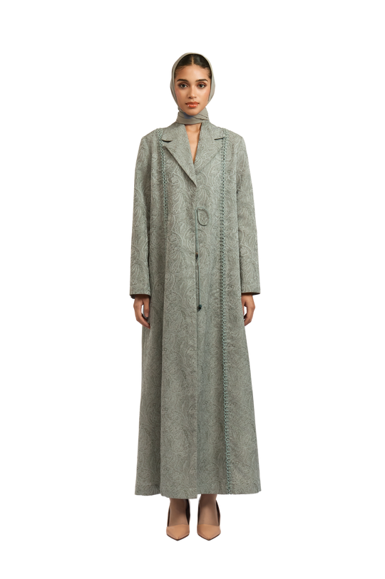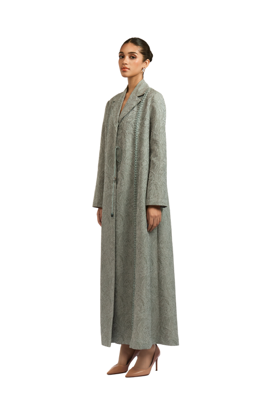 ADISSON channels neoclassical inspiration with a refined silhouette that merges heritage design with fresh modernity. Crafted from jacquard linen in a serene mint hue, the flared-cut abaya showcases a paisley pattern that lends visual interest and gentle movement. A delicate thread work construction subtly structures the garment while tassel drawstrings adorned with signature 1309 beads introduce an artisanal finishing touch.