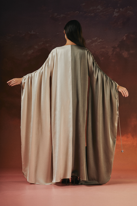 A cozy two-toned dress made from sustainable recycled fabric, featuring a stylish yin-yang design at the center and cut-outs on each side for an intriguing touch. The ruched shoulder seams, adorned with charming accents, elevate this piece for any occasion. With adjustable-length sleeves for a customizable fit, this dress offers a perfect balance of simplicity, elegance, and eco-conscious style.