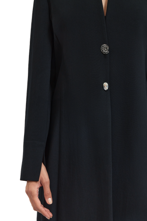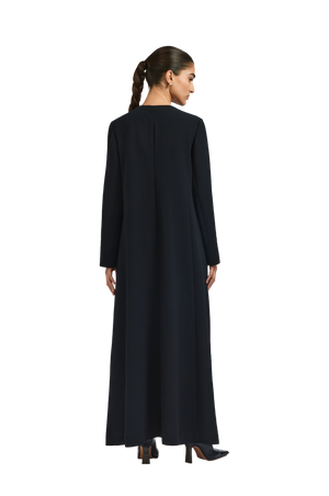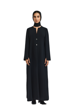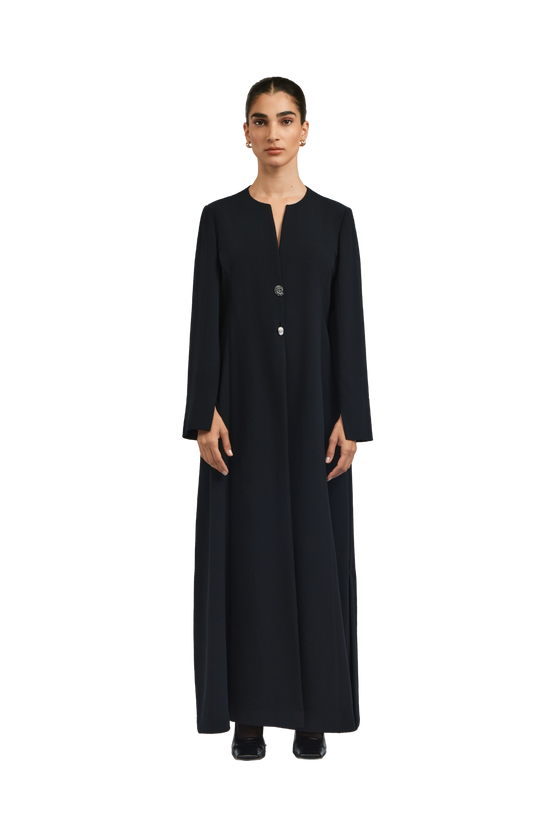 The Amelia Abaya is crafted from textured black crepe, flowing in a graceful A-line silhouette that enhances its timeless elegance. A row of 1309’s signature buttons—featuring polka dot spirals and heart motifs—runs down the center, acting as delicate ornaments that add a touch of charm and distinction.