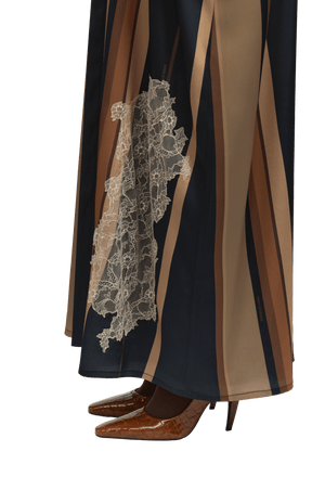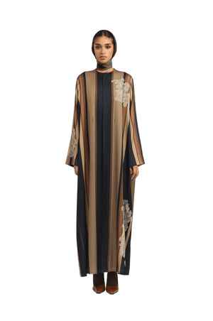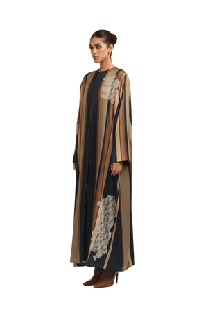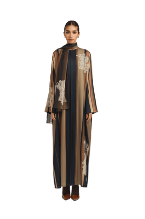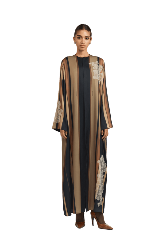 Crafted from fine, textured silk, the Bryn Brown Abaya offers a soft, fluid drape and a naturally elegant finish. The design features graceful stripes in rich shades of brown and black, The abaya is enhanced with delicate lace detailing, adding a touch of refined femininity to the design. creating a sophisticated and harmonious contrast that exudes timeless refinement.