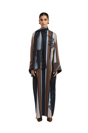 Crafted from fine, textured silk, the Bryn Lilac Abaya offers a soft, fluid drape and a naturally elegant finish. The design features graceful stripes in lilac, dark brown, and cream, The abaya is enhanced with delicate lace detailing, adding a touch of refined femininity to the design. a sophisticated and harmonious contrast. The cuffs are detailed with diagonal lines that complement the overall palette, adding a subtle yet distinctive touch of refinement.