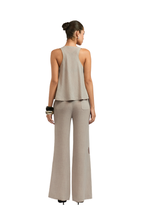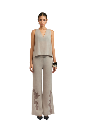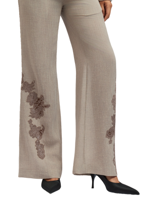 Crafted from a soft, fluid silk, the Camila Pant in beige offers a sophisticated, wide-leg cut that gently grazes the floor. Featuring delicate lace appliqué detailing on the hem, these pants are perfect for adding an elegant touch to any outfit. The flowy fit and luxurious fabric create an effortlessly chic look.