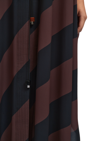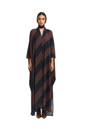 This bisht-cut abaya, crafted from crepe, features a striking brown and black stripe pattern, creating a sophisticated and fluid silhouette. The crepe fabric offers a graceful drape and subtle texture, adding depth to the design. A quilted band around the neckline provides a refined accent, while intricate tassel drawstrings add a playful yet elegant touch. Finished with 1309 beads and cube details, the abaya radiates contemporary sophistication.