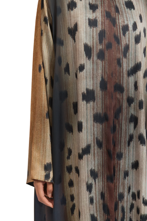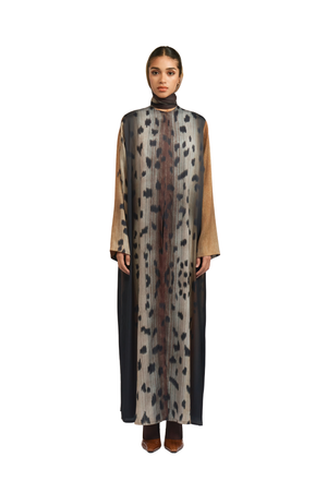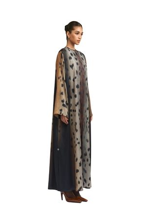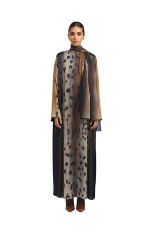 Crafted from rich textured silk fabric, this straight-cut abaya features a bold, earthy animal print that exudes confidence and style.