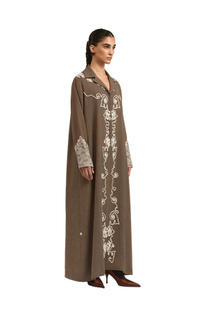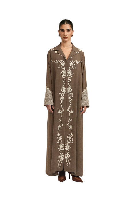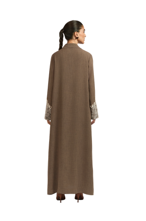 The Cruz Abaya features a breezy A-line silhouette, crafted from dark nude natural linen for a relaxed yet refined feel. This shirt-style abaya is designed with an open-point front, allowing for a modern, flattering shape. Lace appliqué traces the body, while delicate lace embellishments on the sleeves add a soft, feminine touch—where effortless elegance meets timeless charm.