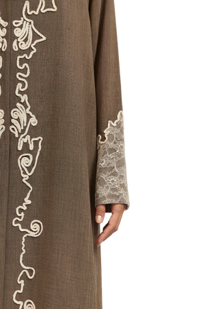 The Cruz Abaya features a breezy A-line silhouette, crafted from dark nude natural linen for a relaxed yet refined feel. This shirt-style abaya is designed with an open-point front, allowing for a modern, flattering shape. Lace appliqué traces the body, while delicate lace embellishments on the sleeves add a soft, feminine touch—where effortless elegance meets timeless charm. Paired with a matching sheila finished with lace-edged detailing.