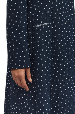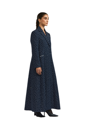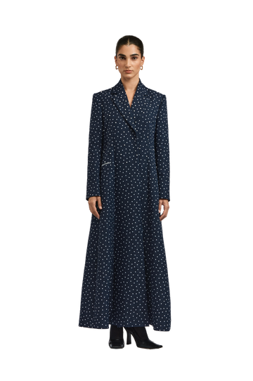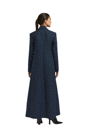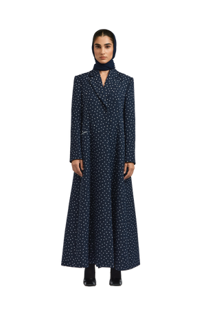 Elise is a slightly waisted abaya, meticulously crafted from rich navy jacquard featuring a subtle polka dot texture. Select polka dots are delicately embroidered with matte beads, adding a refined, textured detail. The design is finished with a signature 1309 beaded logo.