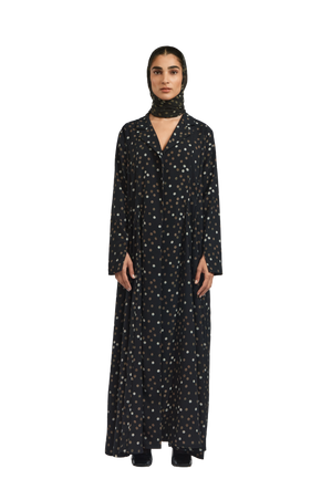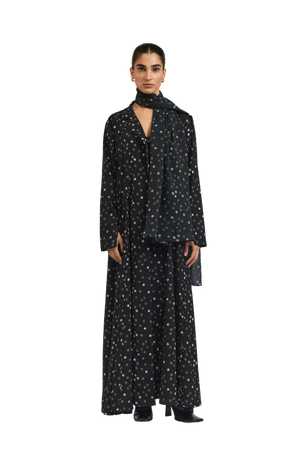 JADE is an effortlessly chic midnight black polka dot crepe silk abaya, gracefully cinched at the waist. Its most captivating feature is the flowing chiffon godets encircling the silhouette, adding movement and timeless elegance. Paired with a matching polka dot chiffon sheila.