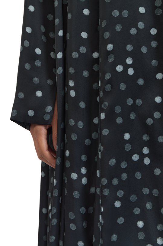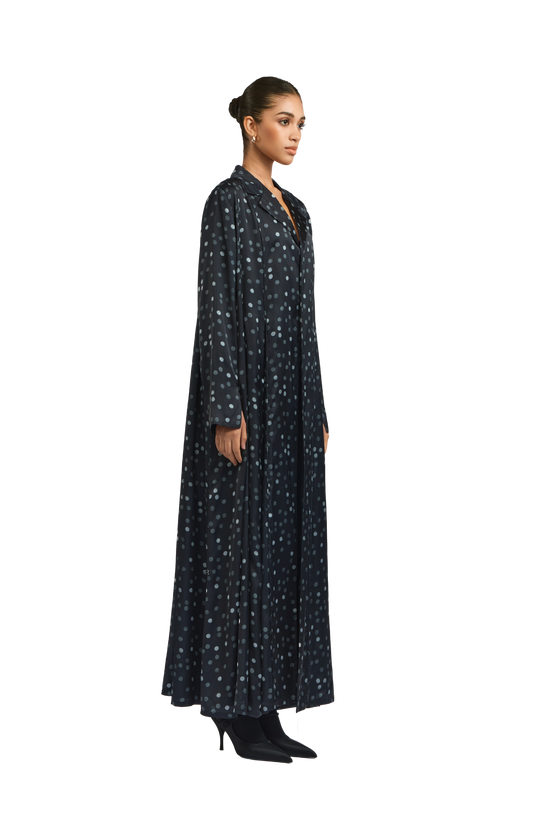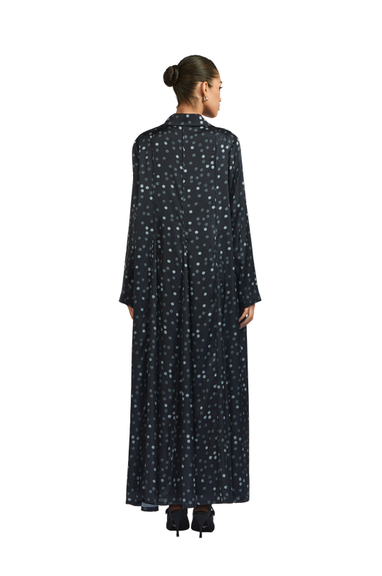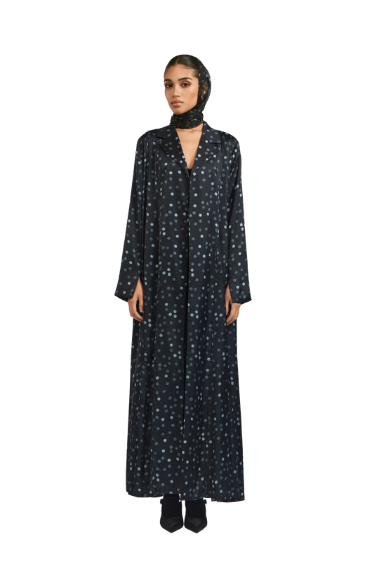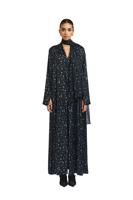 Jade is an effortlessly chic midnight black polka dot crepe silk abaya, gracefully cinched at the waist. Its most captivating feature is the flowing chiffon godets encircling the silhouette, adding movement and timeless elegance. Paired with a matching polka dot chiffon sheila.
