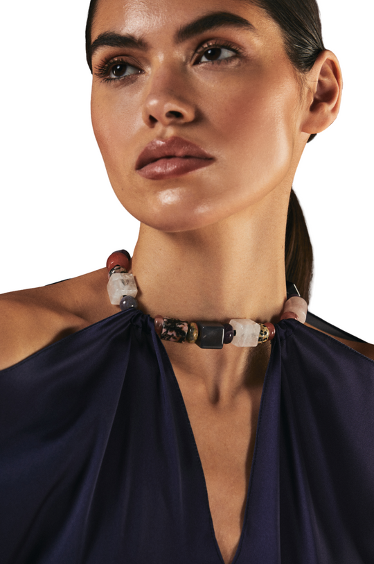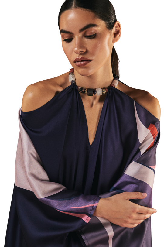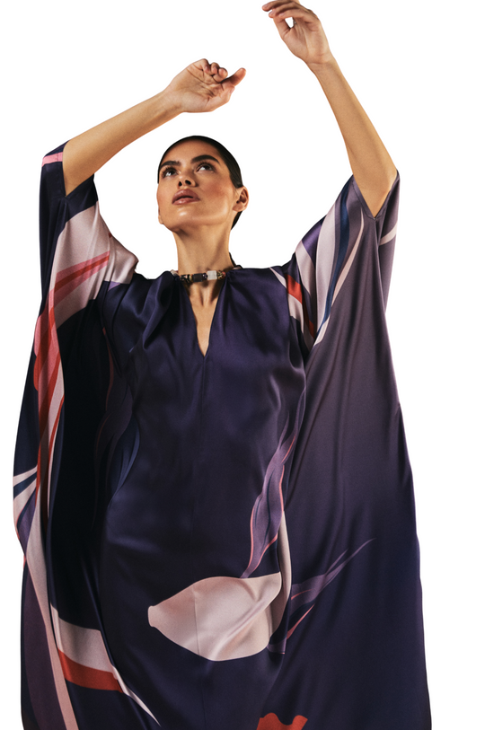 This stunning kaftan, crafted from luxurious silk twill, features an exclusive 1309 in-house fish print that evokes the fluid elegance of aquatic life. The rhythmic, flowing design complements the v-neckline, shoulder cutouts, and an attached beaded choker, blending artistry with modern sophistication.