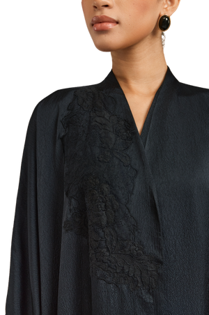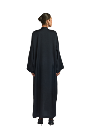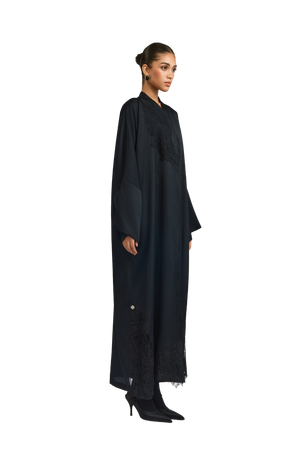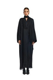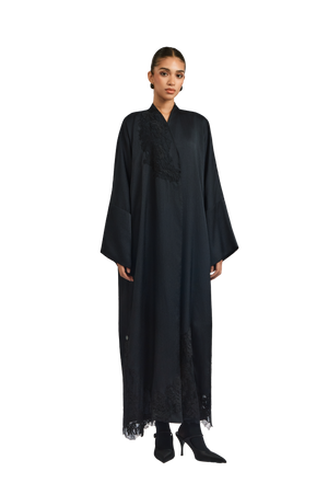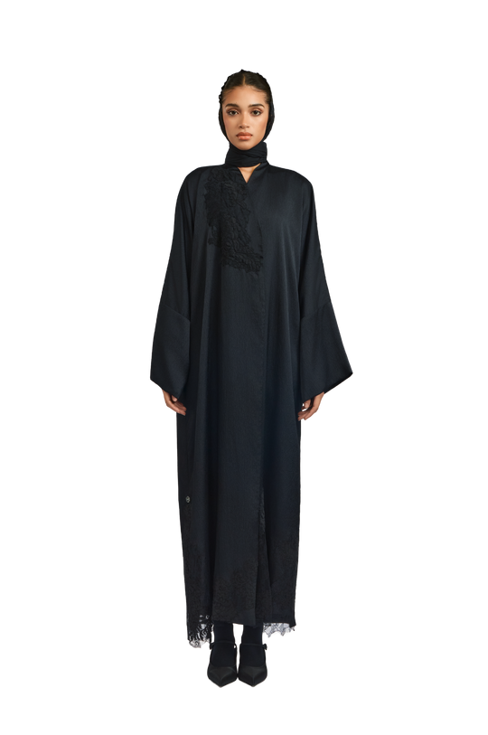 Exuding quiet elegance, the Kia Abaya is crafted from fluid crepe satin in timeless black, offering a soft sheen and graceful drape. Its straight-cut silhouette delivers a sleek, flattering fit, while tonal black lace patchwork is thoughtfully placed throughout the design—adding texture, depth, and subtle sophistication.