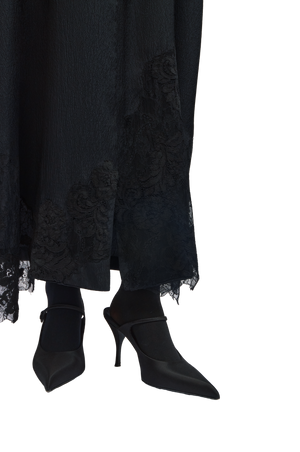 Paired with a wrinkled chiffon sheila, finished with matching black lace detailing.