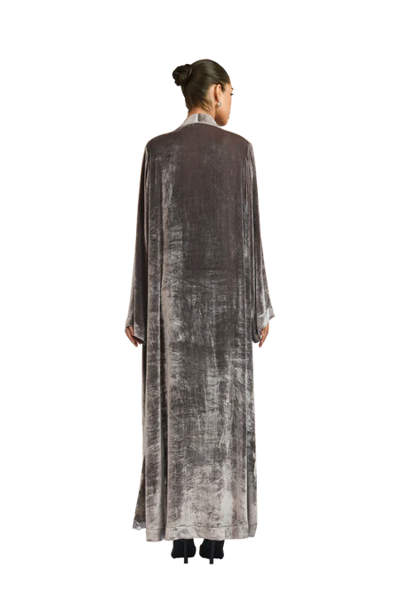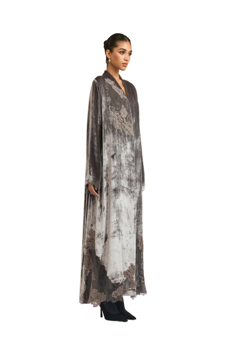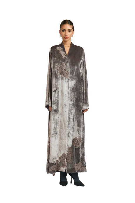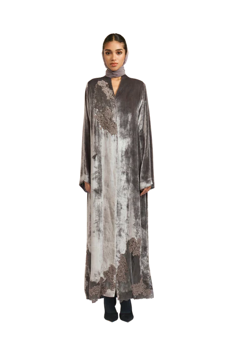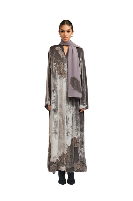 Exuding quiet elegance, the Kia Abaya is crafted from luxurious velvet, offering a rich texture and graceful drape. Its straight-cut silhouette delivers a clean, flattering fit, while delicate lace patchwork is thoughtfully placed throughout the design, creating a subtle contrast that adds depth and refinement.