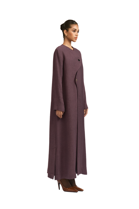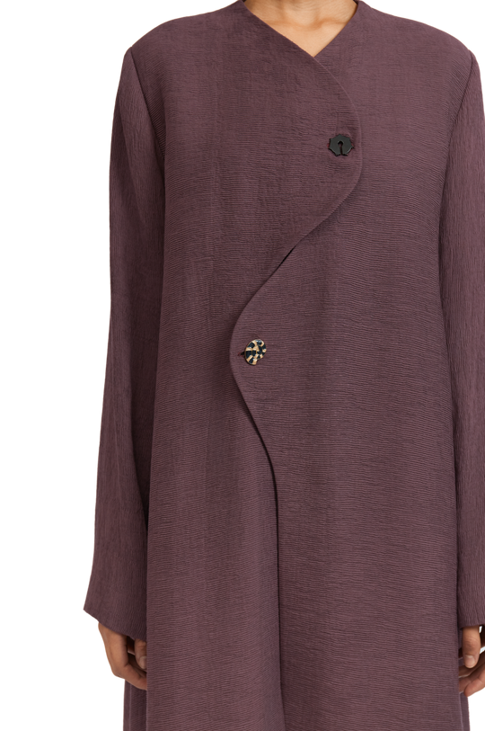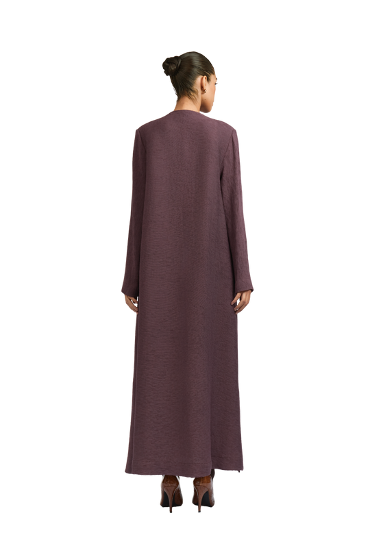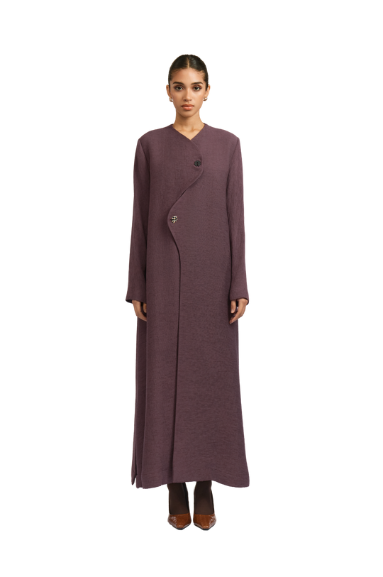 Exquisitely designed, the Kayla abaya features a graceful swirl opening crafted from rosewood jersey, with a unique puzzled swirl closure adorned with the signature 1309 sun and shell button.
