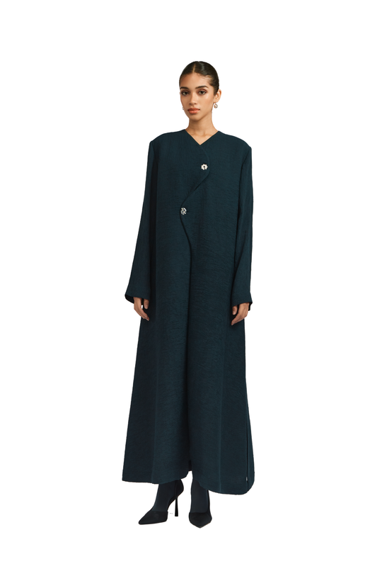Exquisitely designed, the Kayla abaya features a graceful swirl opening crafted from dusty teal jersey, with a unique puzzled swirl closure adorned with the signature 1309 sun and shell button.