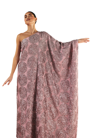 This striking oversized dress features an asymmetrical off-the-shoulder design, exuding modern elegance. What truly sets it apart is the fabric, intricately designed with silver circles that create a captivating texture and dynamic pattern across the entire piece. Its relaxed, oversized silhouette offers both comfort and style, making it a standout piece for any occasion.