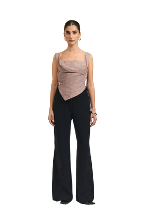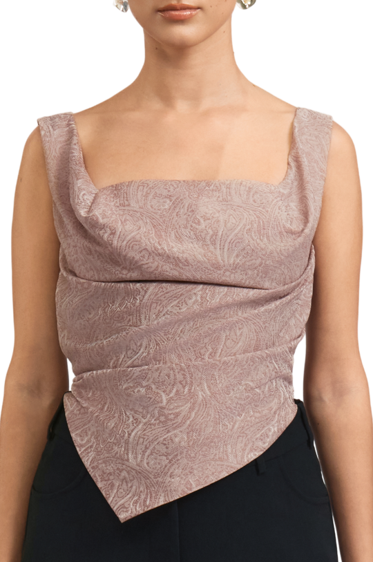 A fushion of elegance and texture, this draped pink top is crafted from rich fabric with an intricate pattern. The soft draped detailing adds depth and sophistication.