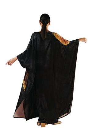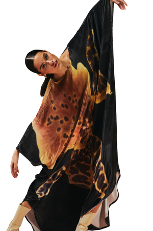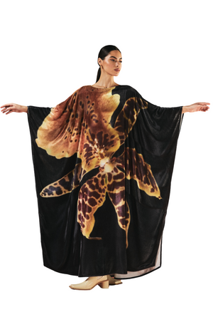 This luxurious velvet kaftan features a stunning, realistic floral print in vibrant yellow and black hues, designed exclusively by 1309 in-house. The lifelike flowers bloom across the soft fabric, creating a sense of depth and artistry. The flowing silhouette offers effortless elegance, blending comfort with timeless style.