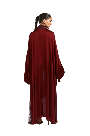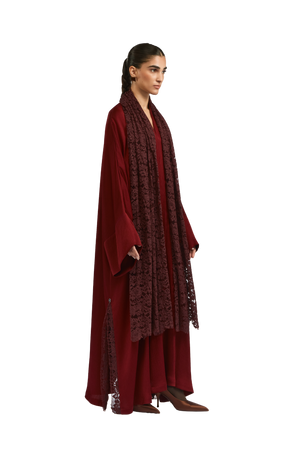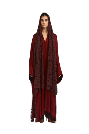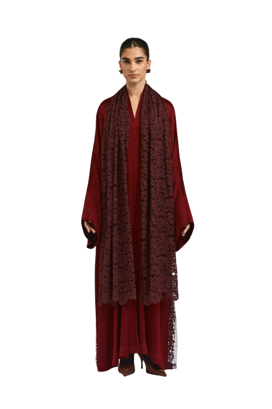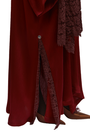 Crafted from premium pleated satin fabric, this burgundy-toned abaya exudes a smooth, lustrous finish that drapes elegantly on the body. The sophisticated square cut offers a flowing, graceful silhouette, while the attached lace sheila in a complementary deep burgundy adds a touch of intricate detail. The side slits, enhanced with lace detailing, provide ease of wear, adding to the overall refinement and luxurious appeal of the design.