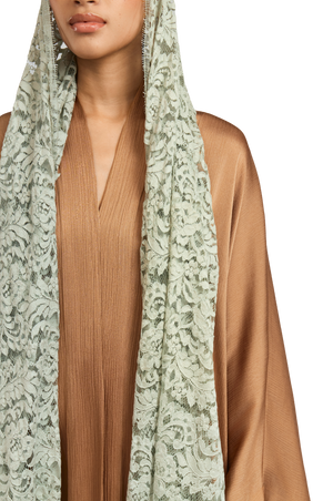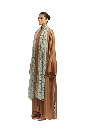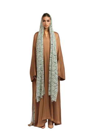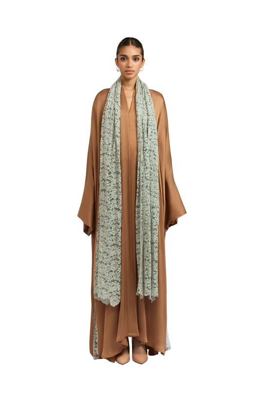 Crafted from premium pleated satin fabric, this nude abaya exudes a smooth, lustrous finish that drapes beautifully on the body. The sophisticated square cut provides a flowing, graceful silhouette, while the attached lace sheila in teal adds a touch of intricate detail. The side slits, enhanced with lace detailing, allow for ease of wear, further elevating the refinement of the design.