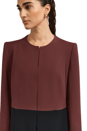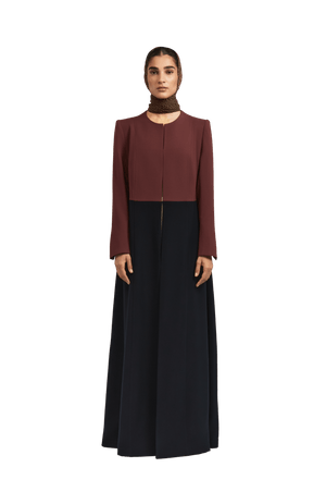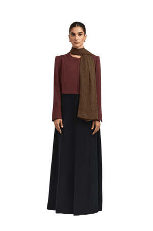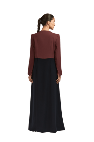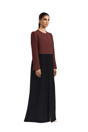 Ophelia brown embodies modern sophistication with a graceful A-line silhouette that balances classic design and contemporary style. Crafted from crepe in a BROWN and black panelled palette, this abaya features a fluid cut that drapes elegantly.