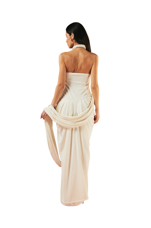 A lightweight, perfectly draped halterneck dress in soft white jersey, designed to effortlessly elevate your evening. The twisted detailing enhances its graceful flow, while the extended scarf offers versatile styling options – wear it draped off your shoulders or elegantly adorned in your hair for a chic finish.