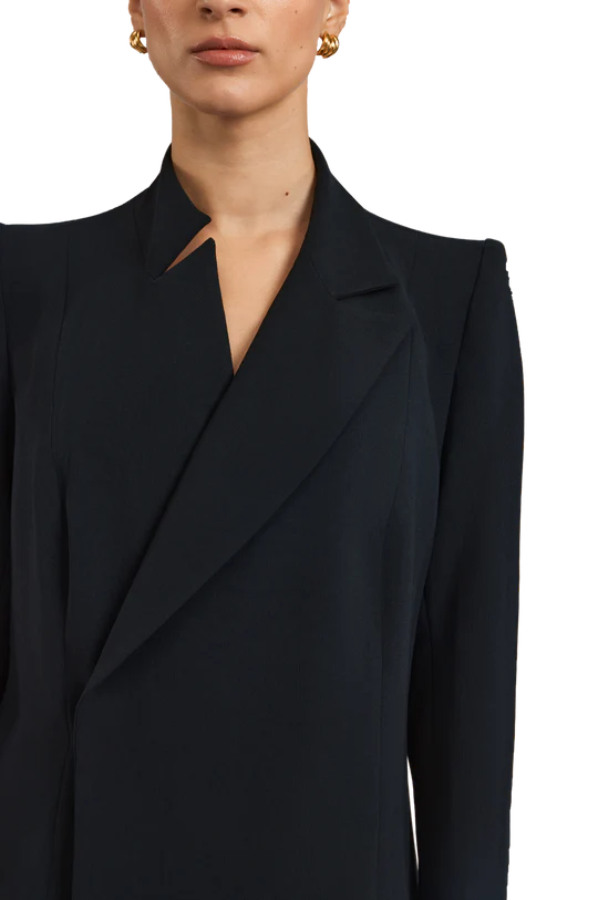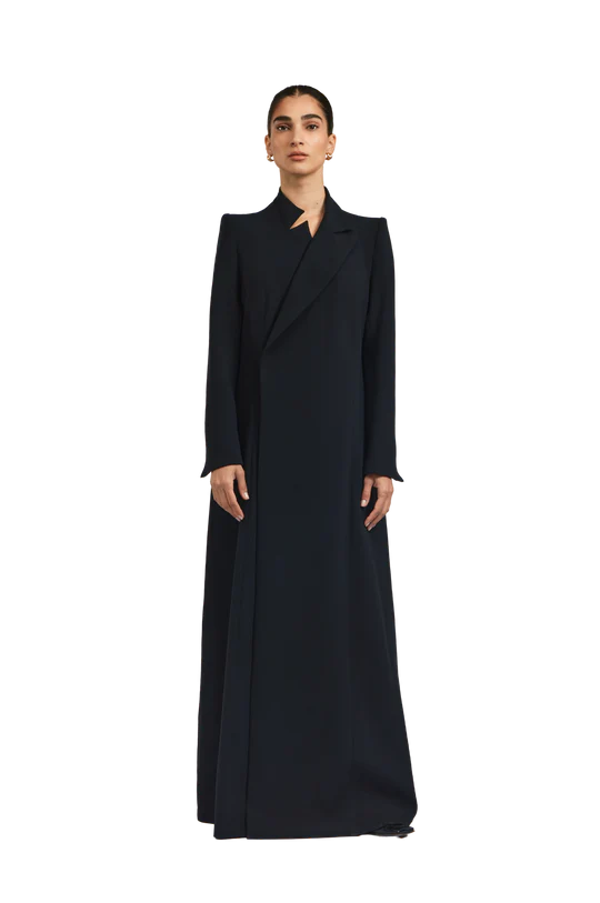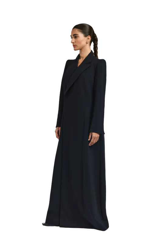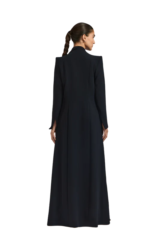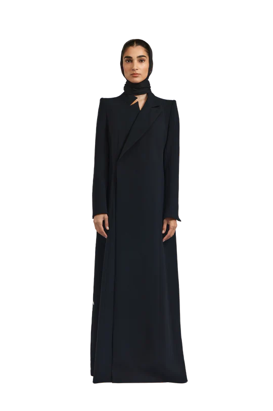 Rumi black abaya exudes effortless elegance with a tailored, blazer-inspired silhouette. Crafted from soft black crepe, the abaya features padded shoulders that provide structure and a poised presence. A subtle side-closure design gently shapes the garment, delivering a polished and graceful finish.