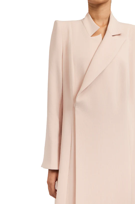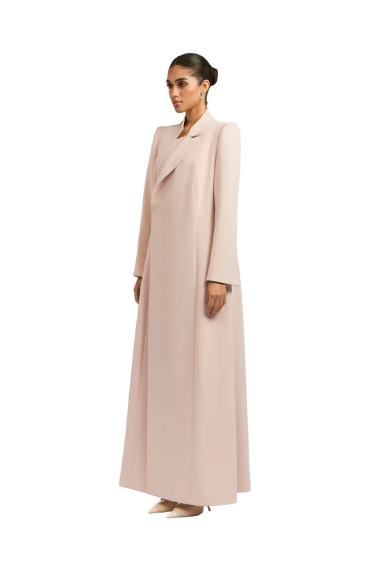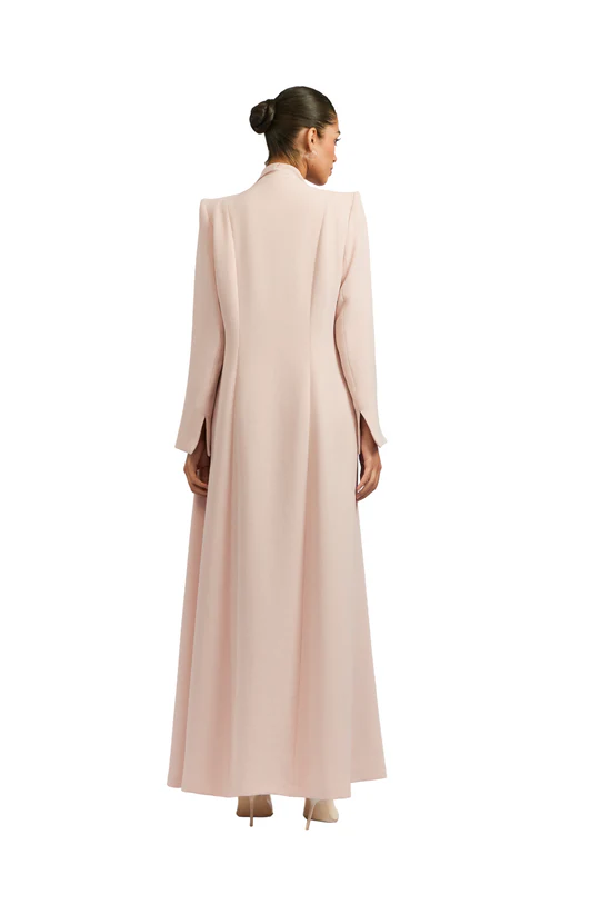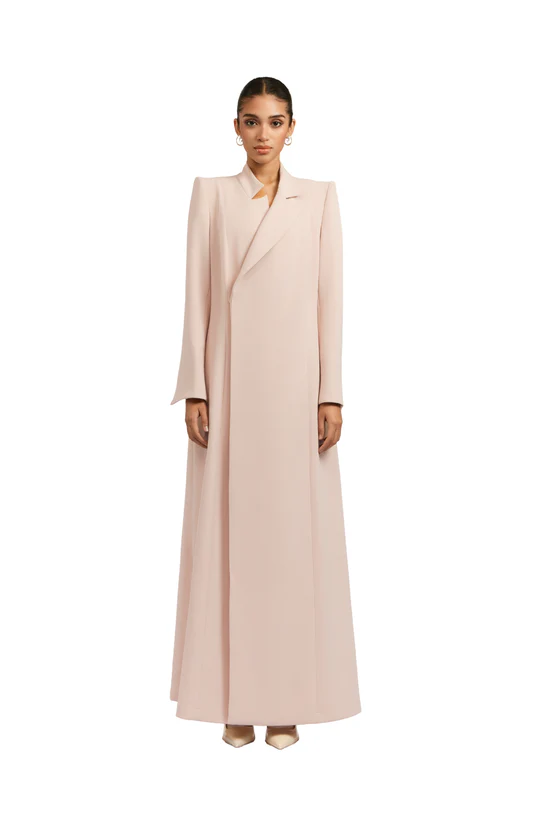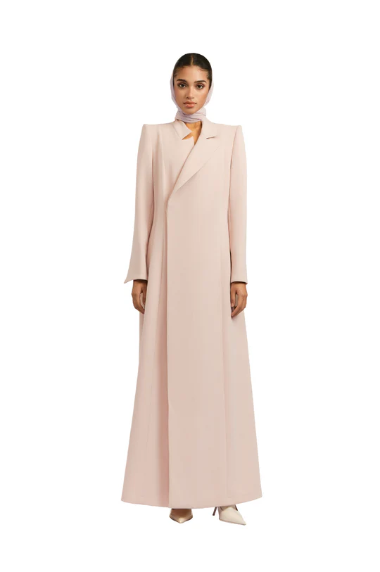Rumi pink abaya exudes effortless elegance with a tailored, blazer-inspired silhouette. Crafted from soft pink crepe, the abaya features padded shoulders that provide structure and a poised presence. A subtle side-closure design gently shapes the garment, delivering a polished and graceful finish.