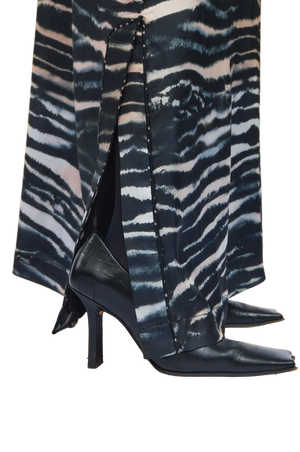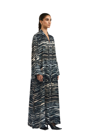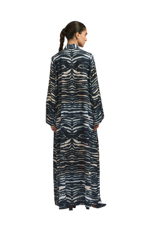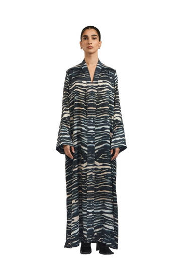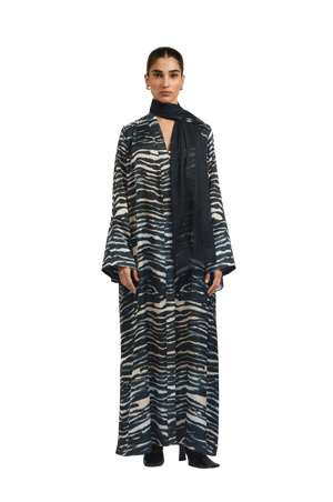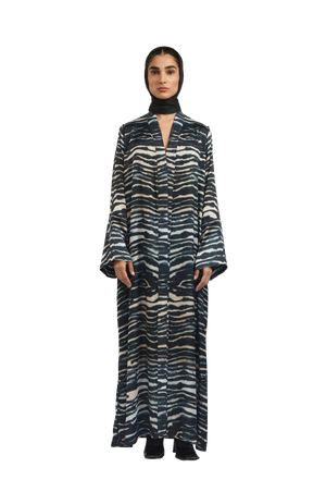 The Sasha 1 Abaya is crafted from RICH silk and adorned with an exclusive in-house 1309 zebra print . A linen quilted band adds texture and structure, complementing the abaya’s fluid, relaxed silhouette. The design reflects a perfect balance of bold artistry and refined sophistication.