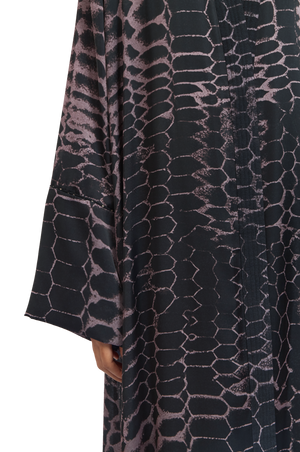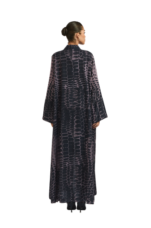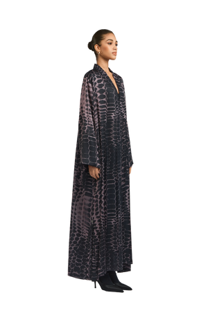 The Sasha 2 Abaya is adorned with an exclusive in-house 1309 python print. A linen quilted band adds texture and structure, complementing the abaya’s fluid, relaxed silhouette. The design reflects a perfect balance of bold artistry and refined sophistication.