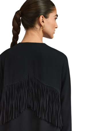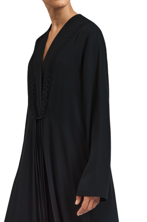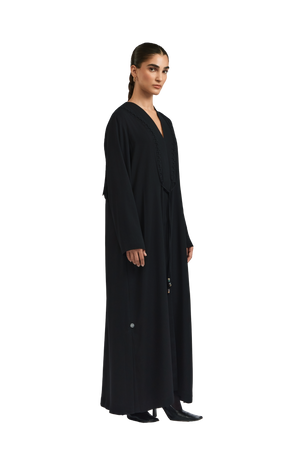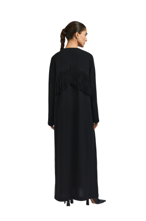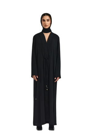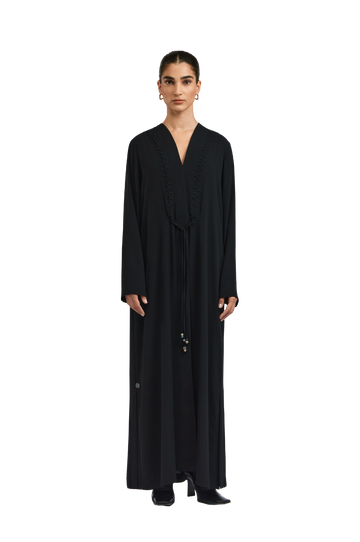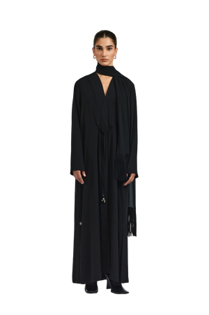 The Serena abaya flows in an elegant A-line silhouette, tailored from lightweight black crepe for a fluid, graceful drape. Braided and beaded accents embellish the front, adding depth and artisanal detail, while soft fringes cascade along the backâcreating a striking interplay of texture and movement.