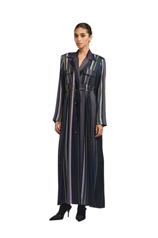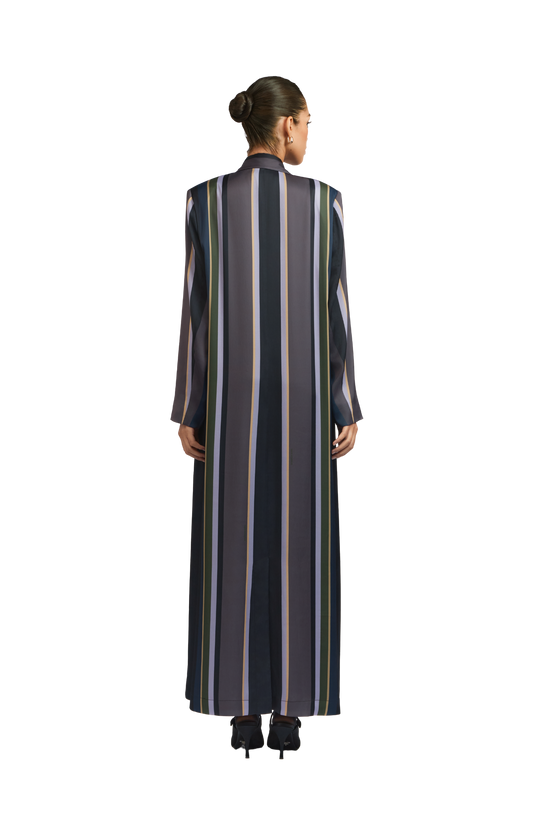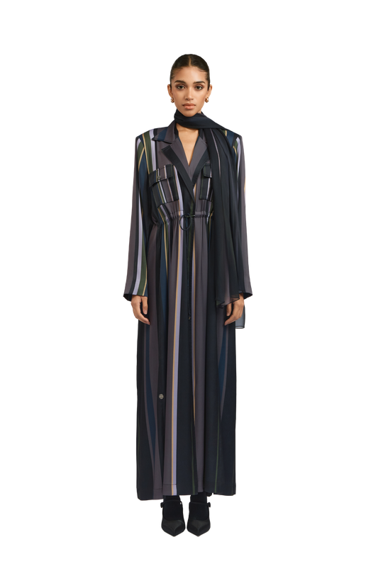 The Sybil Stripe Abaya is crafted in rich twill fabric with exclusive in House 1309 stripe print. It features functional front pockets secured with SpiraL buttons, and a waist‑cinching string finished with the signature 1309 cube bead.this piece embodies refined elegance and versatile sophistication for any occasion.