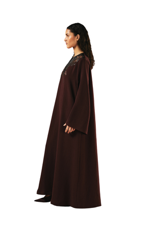 This kaftan is crafted from a rich texture brown fabric, exuding a modern yet timeless elegance. The v-neckline adds a flattering touch, enhancing the silhouette. The design is enriched with a unique western-inspired patchwork, featuring a fish motif meticulously crafted from soft leather, delicate lace, and beaded accents. The fusion of bold patterns with intricate craftsmanship creates a one-of-a-kind piece, seamlessly blending artistic innovation with effortless sophistication.